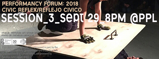This event is SESSION #3 of PPL's 2018 PERFORMANCY FORUM program CIVIC REFLEX/REFLEJO CIVICO, a temporary collective of 20 artists/individuals/groups meet 5 times over the course of the year with public exhibitions of performance, dialogue, and discursive practice at 8pm on April 21, May 26, September 29, October 20, and November 10.