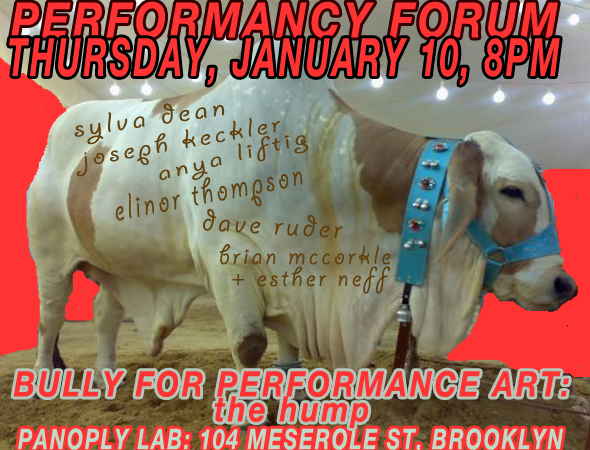 6 performances and roundtable discussion free and open to the public, beer for a suggested donation Self-reflexive performativity comprises PERFORMANCY FORUM as a platform for performance work: part critical thinktank, part performance series, and part community gathering, this installment will take place in Brooklyn, NY at Panoply Performance Laboratory.